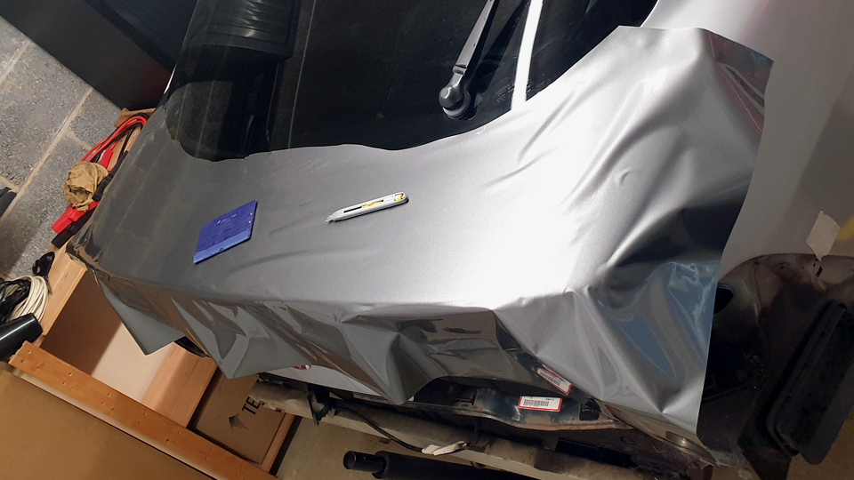 The last bit of wrapping was the toughest; the rear bumper. It took several inlays in the tailgate catch section and the number plate recess, then a final single piece three meters long to wrap around the whole bumper in one section. The curve of the rear face into the sides allowed a little gather to help get into the rear light recesses, but it took a bit of fiddling to get it all in. Everything was tucked with plenty of overlap on the rear, and careful post heat to get everything cured in place.