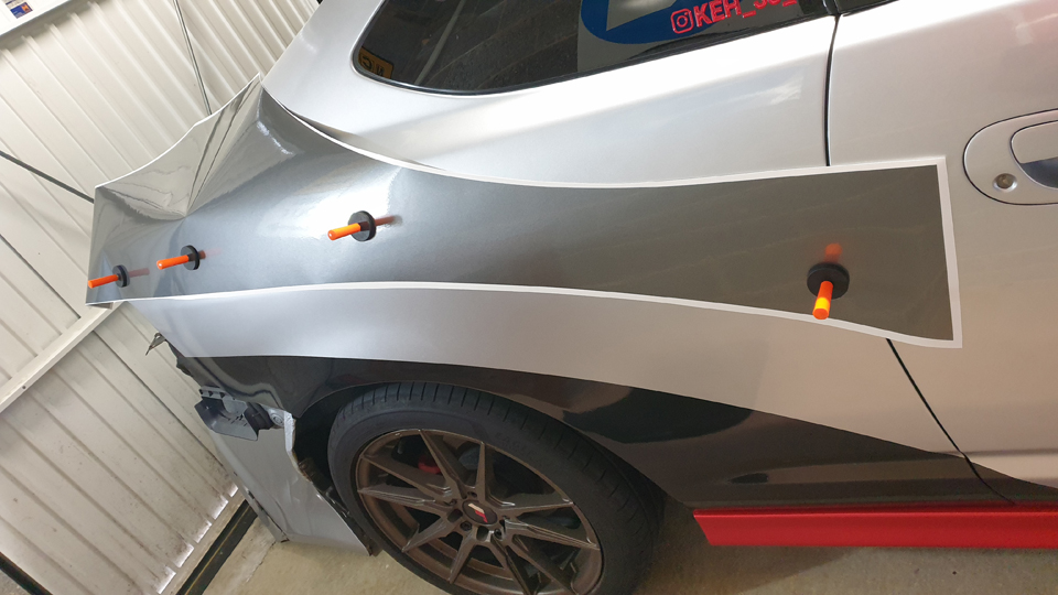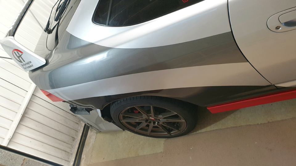 The remaining wrap parts were a bit more tricky as the flowing curved sections needed to be pre-cut, with overlap, before laying on the car. Then when fitting care needed to be taken not to pull the vinyls out of shape. With due care and attention this was completed on the sides, rear and tailgate, getting the lines flowing nicely together with the mix of charcoal and black over the silver base. The spoiler blade was wrapped and some logos were added there, as well as the rear screen.