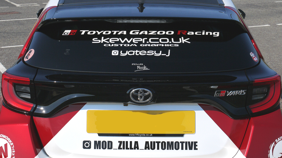 The customers' own Modzilla Automotive logo was included, together with logos of various other mods on the car, and a bit of Skewer was thrown in on the side door number cards and a one off decal on the bonnet. As always, the Graphics by Mook signature logo was added to the rear screen