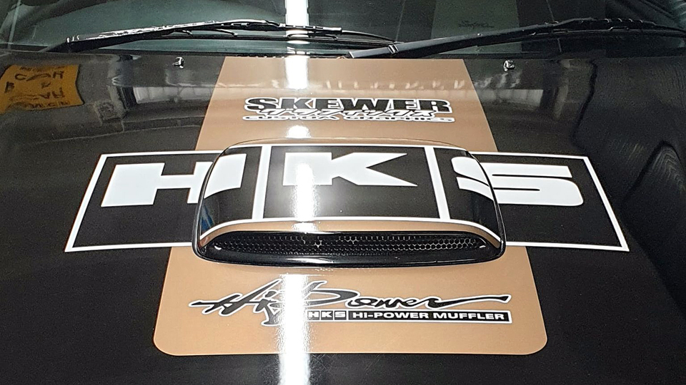 Some of the main differences to the mkV design were as follows; switch the gold to bronze for the central stripe, switch Super Oil to Hi-Power Muffler (as the car has one) and omit the majority of the extra logos. The bronze stripe was added first, ensuring everything was perfectly centred. Templates were created to pre-cut the bronze around the bonnet vent, which complicated matters a little. The main HKS logo needed to sit in that position otherwise it would appear too high or too low. Once that was sorted, the logos on the stripe were added.