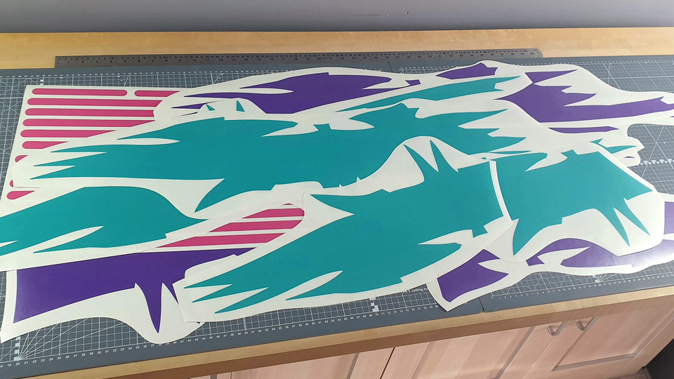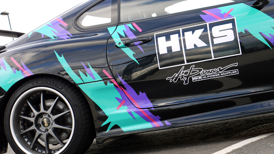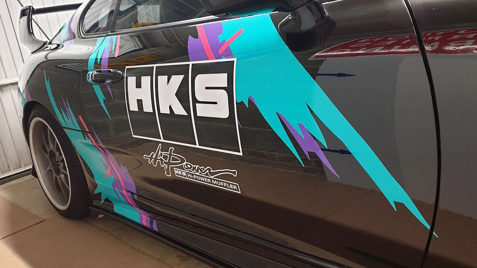 Next came the flashes. The cyan and purple sections were cut separately, then the purple pieces were fitted first, with the cyan laid on top. The main consideration here was getting nicely proportioned separation between each section of vinyl and ensuring everything was parallel, or at least as much as it can be on the curved surface of a car! The pink stripes were added next, ensuring they were lined up nicely, and finally the main HKS logos were applied to the doors.