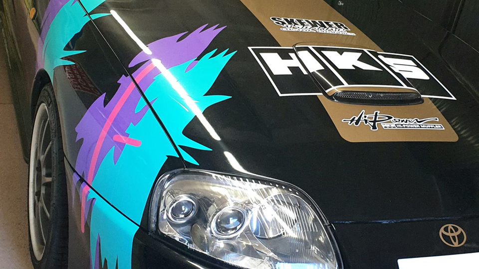 The owner of this fine vehicle is an HKS nut and has had an HKS livery in mind from day one. We were able to go for pre-cut vinyls and then layer them as required on the car. The only question was how to put together a design. The mkV Supra had been out for a bit and HKS had released a black one with a full livery, not the diagonal version of the 90's but a less full on symmetrical design with a central gold stripe taken from the Super Oil logo. After some back and forth we decided on a version of this. The car was dropped off, and work began.