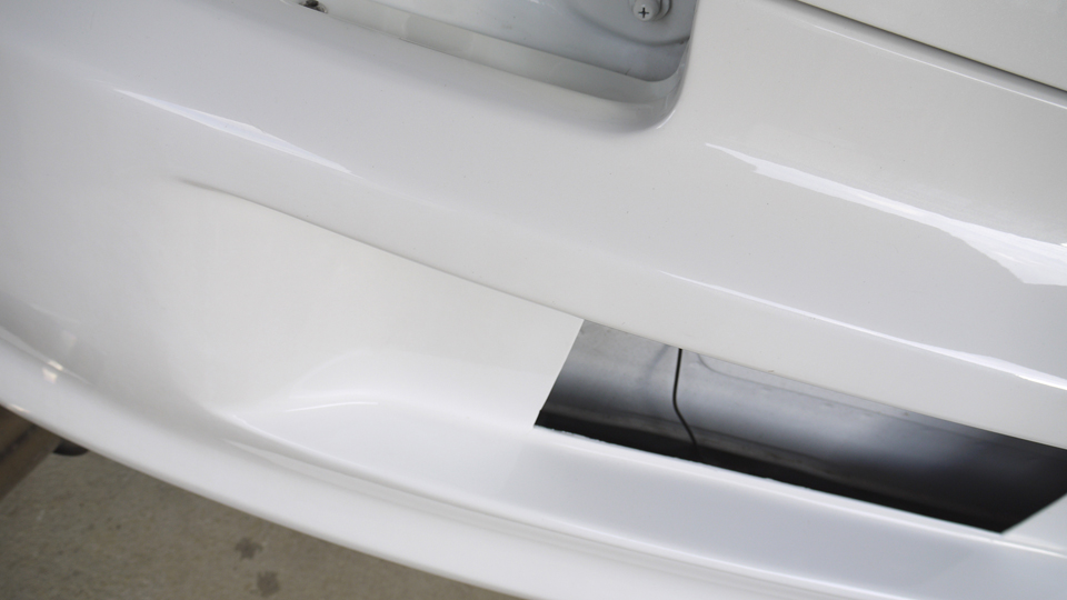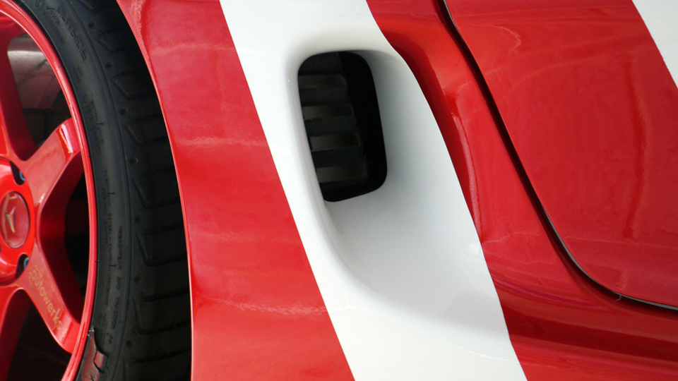 With the back end wrap now complete it was a case of finishing off the side stripes and adding the logos. With the many curves of the car it was easier applying knifeless tape down the lines of the stripes than it would have been using a straight cut piece of vinyl, especially around the vents in front of the rear wheels. The logos were then a simple job to complete the look.